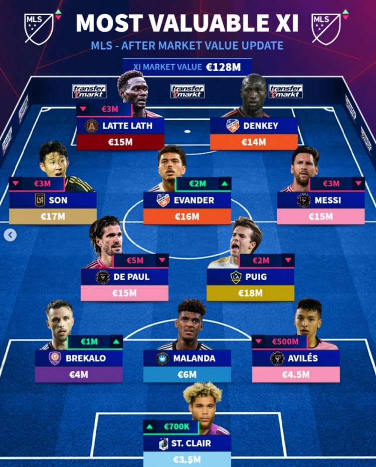 12月12日讯 德转更新了美职联球员身价,并列出了更新后身价最贵阵容,梅西、孙兴慜、德保罗、普吉在列。